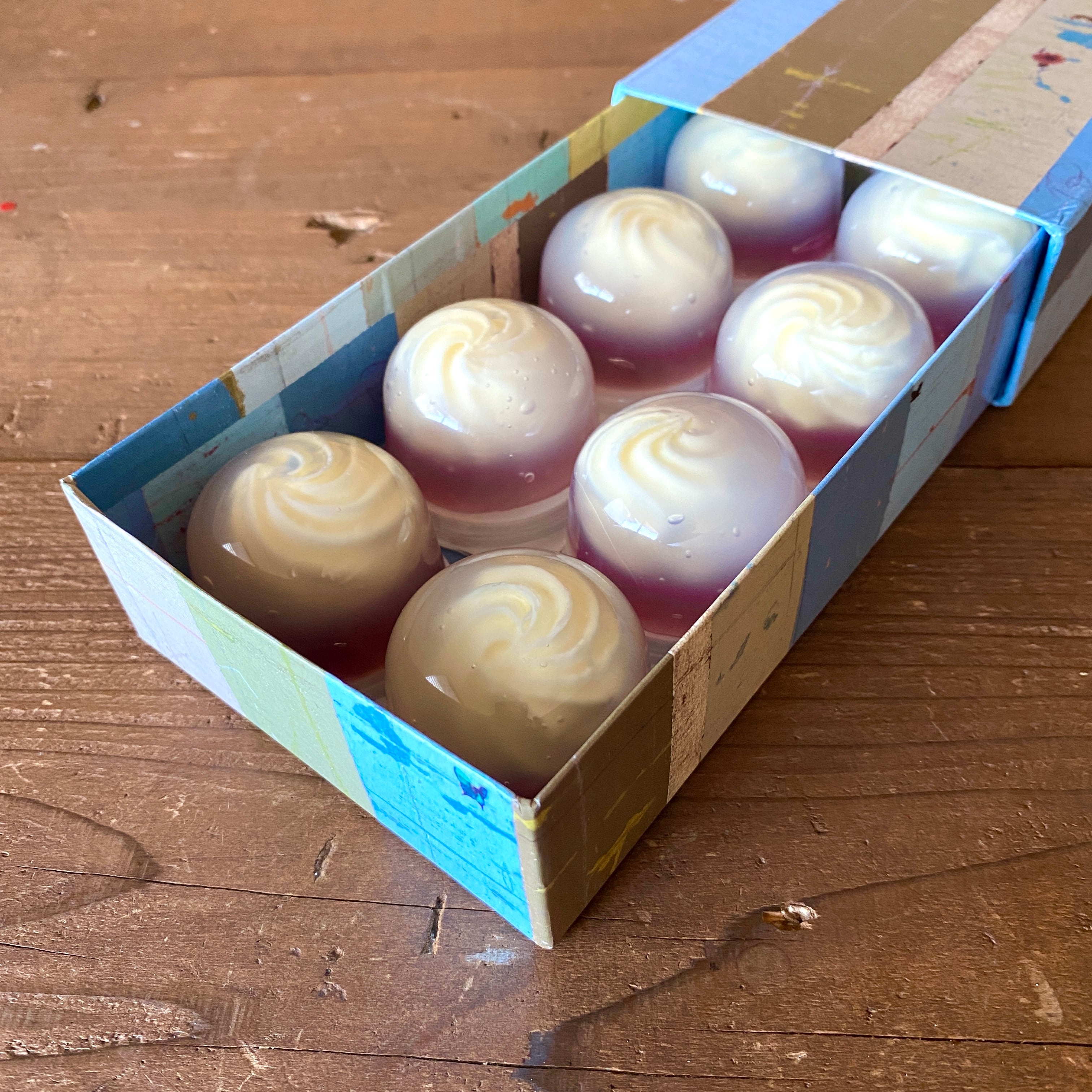 つるん〜♪ぷるん〜♪もっちりとした水まんじゅうの生地に、オーストラリア産の滑らかなクリームチーズを使ってレアチーズケーキに仕立て上げる、かねい独自の製法で可愛らしく閉じ込めました。水まんじゅうの二層からなる生地はほのかな葡萄の香り。見た目に違わずその食感や味を引出すために一つ一つが職人の手作りです。